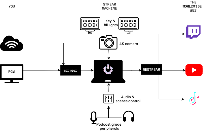 We offer a comprehensive tech solution for co-streamers at your event, providing everything needed for a seamless, high-quality broadcast. Our package includes a broadcast-quality camera, professional microphone and headphones, a dedicated streaming computer, essential peripherals, and optimized lighting.